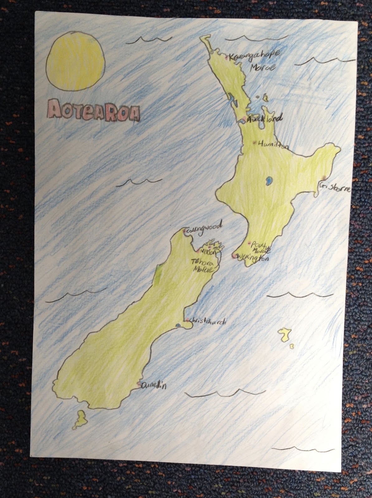 Mia drew this map of NZ and highlighted places that were important to her family.